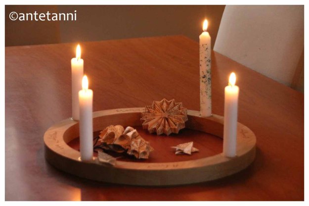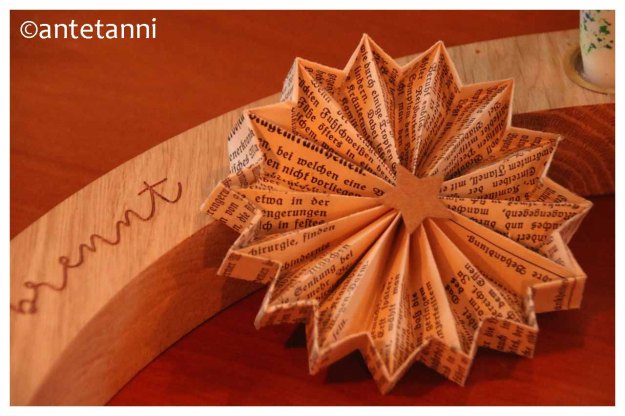 Auf dem Tisch stand auch noch der schlichte Adventskranz aus Holz. Diesen Ring habe ich vor Jahren gekauft und mag ihn sehr gerne. Mein Mann findet ihn richtig doof, ihm ist das viel zu wenig Schnickschnack im Advent. Auf den Adventskranz aus Tassen hatte ich dieses Jahr jedoch keine Lust, weil die Deko dafür in irgendeiner der unzähligen Kisten mit Advents- und Weihnachtsdekoration im Keller liegt und ich nach der Rückkehr aus dem Urlaub Mitte Dezember keinen Nerv hatte (im Büro steppte so unendlich der Bär, dass ich nicht wusste, wo mir der Kopf steht), die ganzen Kisten durchzusuchen (Merker: Die Kisten müssen driiiiiiiiiingend entrümpelt, richtig sortiert und beschriftet werden!). Dieses Jahr war und ist mir ohnehin nicht so sehr nach Dekoration und so kam mir der schlichte Holzring mit Kerzen gerade recht. Auch ihn zieren Papierbasteleien aus alten Buchseiten.