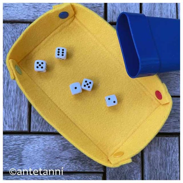 Hach, wie ich mich freue. Filz war ja deine Idee im diesjährigen BINGO und ich hatte echt Furcht vor diesem Feld. Dass ich nun eine Idee dafür gefunden habe, die so gut ankommt, das lässt mich strahlen. Der Filz ist super, um darauf zu würfeln, wir haben inzwischen einige Runden gespielt. 🎲 Praktisch finde ich, dass die Schale immer dabei ist und keinen Extraplatz benötigt oder vergessen wird.