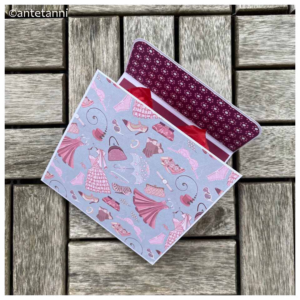 Die Grundkarte ist aus einem weißen Tonkarton mit 250 g/m², für die Tragetasche habe ich ebenfalls einen Tonkarton (hier mit Motiv) in dieser Stärke verwendet. Für die großen Innenflächen habe ich normales Tonpapier (ich weiß gerade nicht, wie stark das ist, etwa 100 g/m² schätze ich) verwendet (ich glaube, im Papierbastelsprech heißen diese Teile „Mattung“, auch wenn sie dafür vermutlich stärker sein sollten). Auf die Lasche innen und auf die Außenseiten habe ich wieder Motivkarton (wie für die Tasche) geklebt. Ich freue mich riesig, dass im Fundus ein Motivkarton mit Kleidermotiven lag, das passt so schön, ich bin selbst ganz verliebt in das Motiv. ♥ Unter der Lasche verstecken sich übrigens die Magnete, die die Karte verschließen.