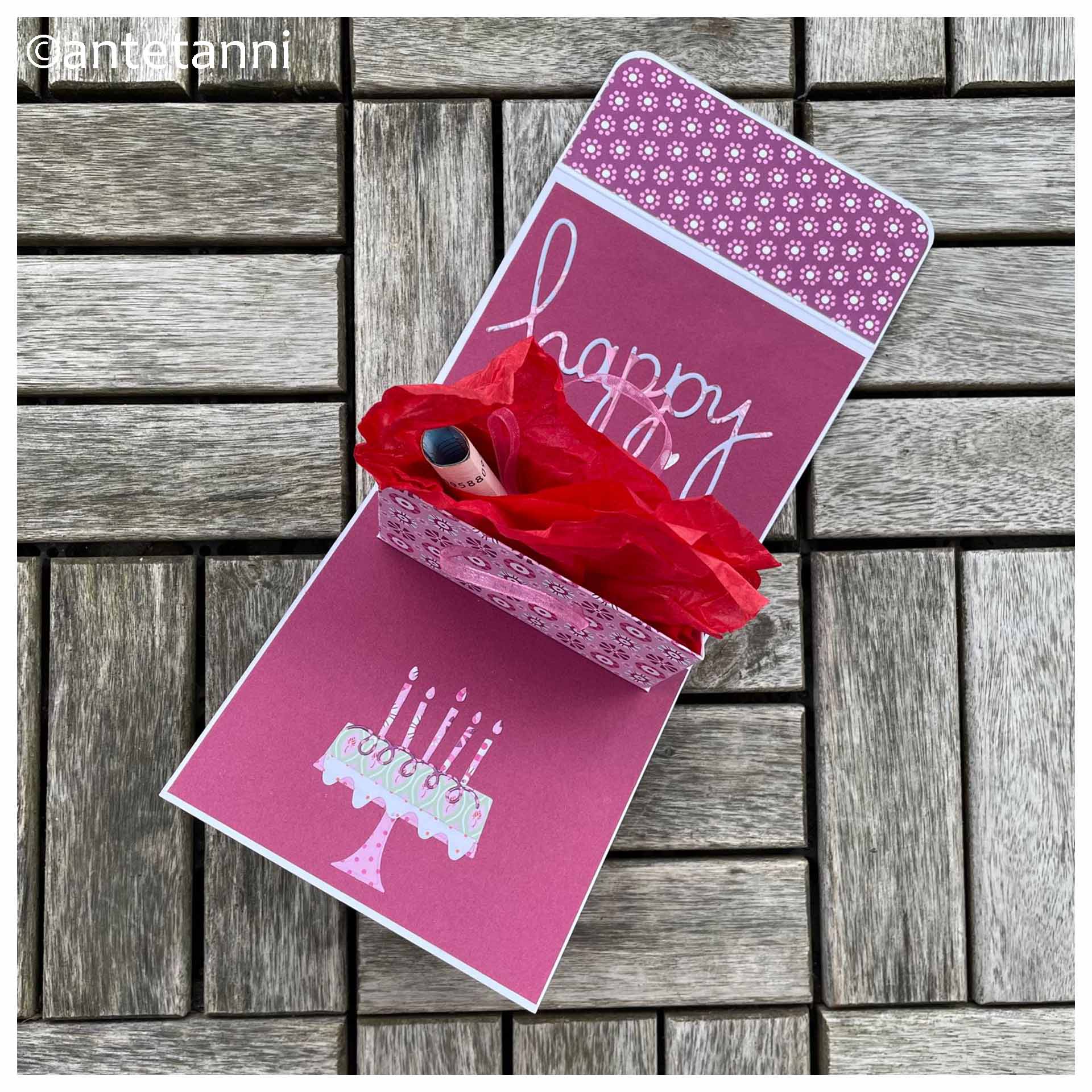 Stilecht für eine Einkauf habe ich wieder eine Klappkarte mit Pop-up-Effekt gebastelt, ähnlich der Geschenkverpackung im letzten Jahr für die Nichte.