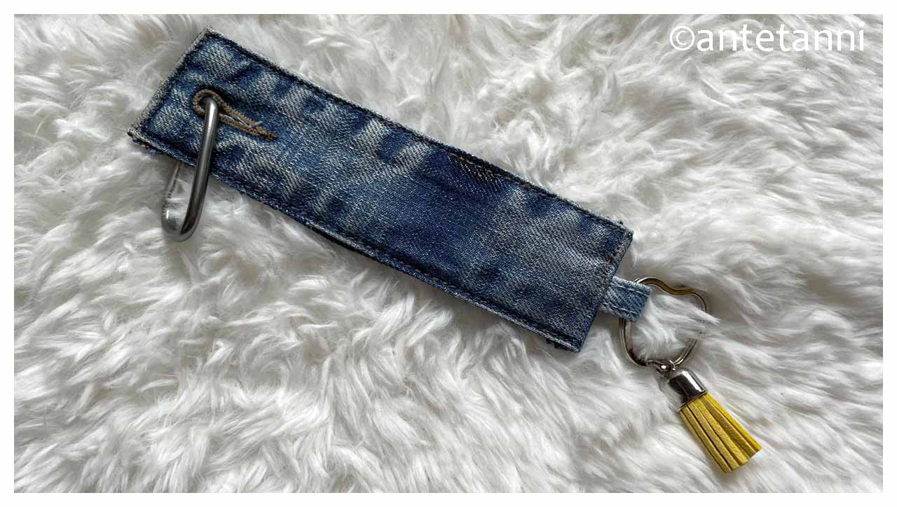 An einem sonnigen Sonntagnachmittag Ende April war mir nach Gelb und ich hatte wohl auch noch die Apfelblüte aus dem Garten im Kopf, und so habe ich das Projekt Schlüsselanhänger und Überraschung in Blau und Gelb anstelle alltagsbunt 😉 umgesetzt. Aus Jeans(resten) ist ein schlichter Schlüsselanhänger aus einem Reststück eines Hosenbundes entstanden. Daran befestigt ein Schlüsselring (Spaltring) in Apfelform und eine Quaste in Gelb. In das ursprüngliche Knopfloch des Hosenbundes habe ich einen Karabiner gehängt, so verfügt der Schlüsselanhänger über genügend Platz für Schlüssel und mehr, lässt sich selbst aber auch perfekt auf- ähhhh… anhängen. Mehr Motto geht fast nicht. 😉