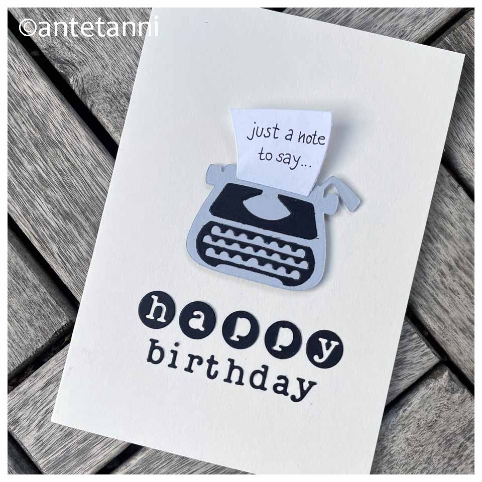 Auf eine Blankokarte habe ich eine ausgestanzte Schreibmaschine mit diesen 3D-Klebedingern geklebt. In der Schreibmaschine steckt ein kleiner Zettel zum Herausnehmen und die in Typewriter-Buchstaben ausgestanzte Botschaft ist ja eindeutig.