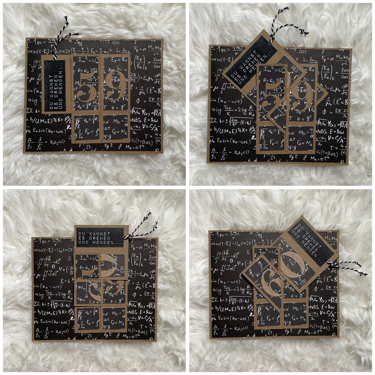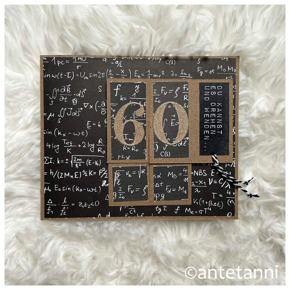 Die Karte ist aus Kraftpapier, ebenso die Drehelemente sowie die 59. Die 60 ist aus goldenem Glitzerpapier, wie sich das für einen runden Geburtstag gehört. 😀 Verziert ist alles mit einem für einen Ingenieur passenden Designpapier mit mathematischen Formeln. Und innen blieb schließlich genug Platz für unsere Geburtstagsgrüße.