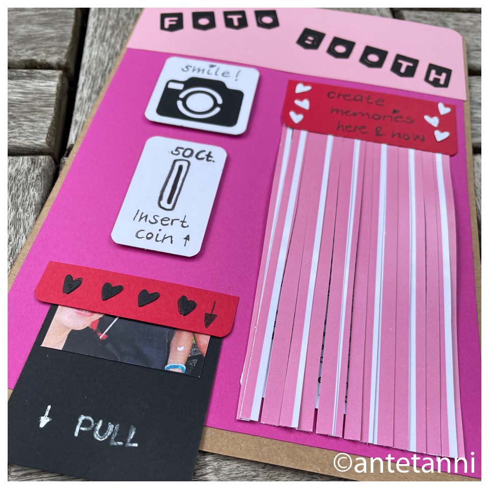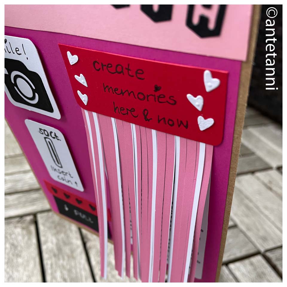 Den Vorhang habe ich ausgedruckt, in Streifen geschnitten und unter die rote Blende geklebt. Das magentafarbene Papier habe ich nur am Rand und unter dem Vorhang aufgeklebt. Links habe ich in der Breite des Fotostreifens mit dem Cutter einen Schlitz geschnitten, sodass dieser herausgezogen werden kann. Eine Blende mit aufgeklebten Herzchen verschönert den Ausgabeschlitz. 🙂