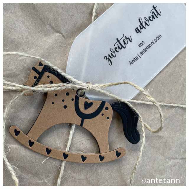 Nachhaltigkeit spielt beim #DNAS2025 auch in Sachen Verpackung eine große Rolle. Ich habe Packpapier wiederverwendet, die Päckchen mit einer Kordel aus Naturmaterial zugeschnürt und zur Zierde noch ein Schaukelpferd aus Kraftpapier an jedes der Geschenke gehängt. Das Transparentpapier, das ich für die Beschriftung der Päckchen und für die jeweils noch beiliegende Weihnachtskarte verwendet habe, stammt aus dem Fundus und ist FSC-zertifiziert, passt also auch. Juche.