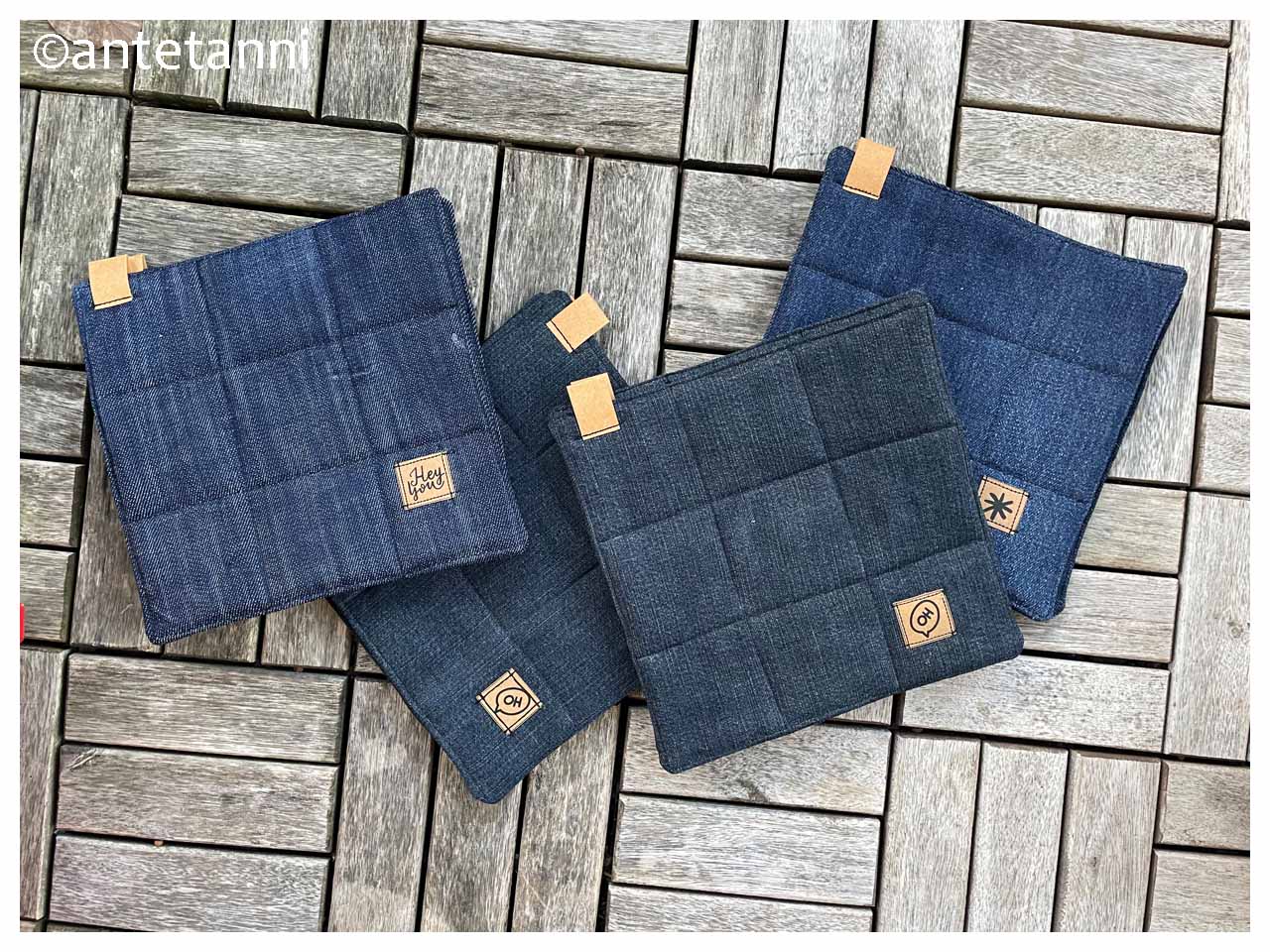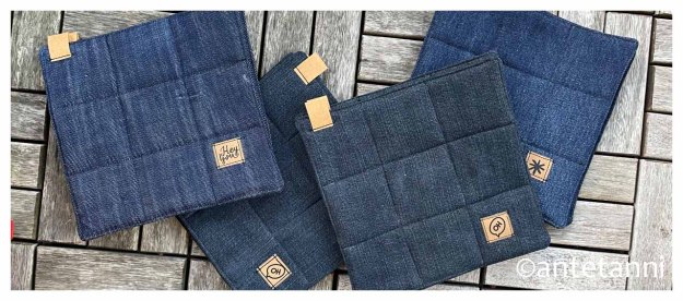 Ich wollte etwas beisteuern, das praktisch respektive nützlich ist und das sich bei Nichtgebrauch klein machen und in der Schublade aus dem Blickfeld verschwinden kann. Ich habe zudem – nach den Mugrugs, die ich bei meiner ersten Teilnahme am #DNAS2020 genäht hatte, und den runden Täschchen vom #DNAS2024 – wieder zu meinem Lieblingsmaterial Jeans gegriffen und für den #DNAS2025 Untersetzer aus Jeans genäht. Je Wichtel im Doppelpack, so lassen sich die Topfuntersetzer auch als Topflappen verwenden. Dank des robusten Materials sind sie gut in der Maschine zu waschen. Ein paar Ziernähte, um das Thermolam innen am Verrutschen zu hindern, und ein bisschen SnapPap als Hingucker, mehr Schnickschnack gibt’s nicht.