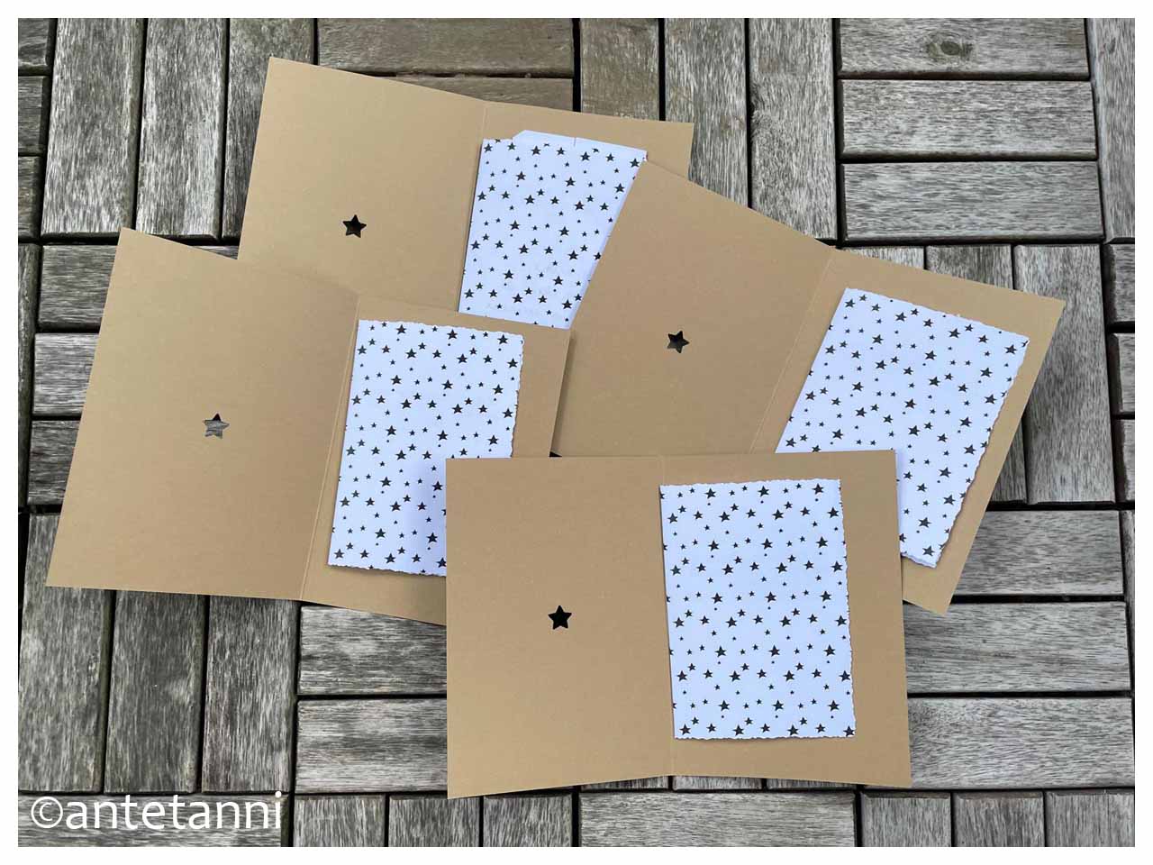 Unter anderem habe ich in Kraftpapier-Karten aus dem Fundus einen Stern ausgestanzt und jeweils einen beidseitig bedruckten Einleger mit meinen Weihnachtsgrüßen eingelegt. Für die Empfängerinnen dieser Karten gab es außerdem noch eine kleine Bastelei mit dazu. Passend auch im neuen bzw. für das neue Jahr. Mehr dazu morgen im Blog.