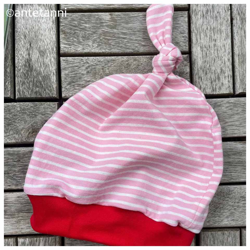 Im Umfeld gibt es kein Baby, dem die Knotenmütze – für Babys von etwa 6 bis 12 Monaten – passen könnte, aber auf der Kinderkrebsstation des Virchow Berlin, für das ich in diesen Tagen Kissenbezüge und Luftballonhüllen genäht habe, werden gerne auch Mützen aus Jersey genommen und so habe ich mich gestern Mittag nach der Arbeit kurz hingesetzt und die Mütze vollendet.