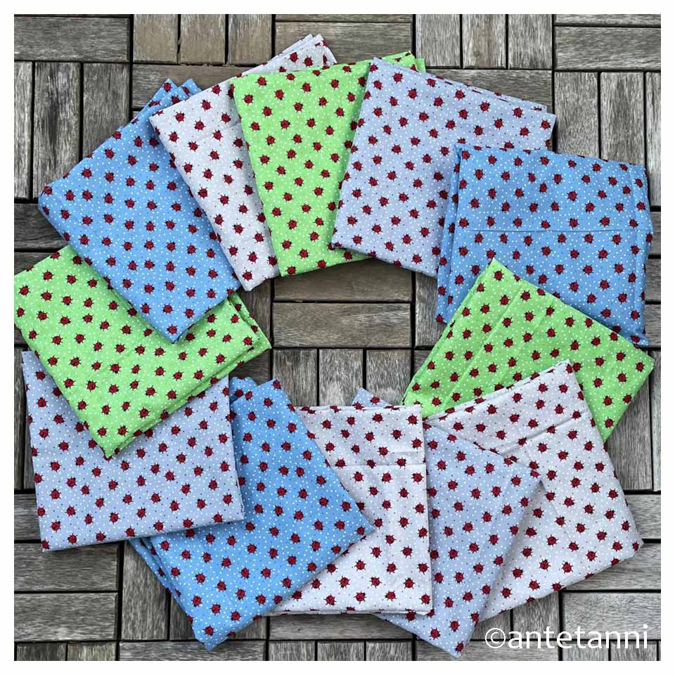 Dekorationen habe ich, wenn ich die Blogbeiträge richtig verschlagwortet habe, bereits in meinem ersten Bloggerjahr – 2013 war das – genäht. Damals hatte ich ein Schnittmuster samt Stoffen von Tante Ema gewonnen und entstanden sind die Eulen Marie & Maurice, die lange als Kuschelkissen bei uns im Einsatz waren. Ich weiß, ehrlich gesagt, gar nicht mehr, was aus den beiden lustigen Gesellen geworden ist… 2014 folgten die ersten Kissenbezüge – der erste entstand gleich als Upcycling-Projekt aus einem ausrangierten Herrenhemd und ich freue mich sehr, dass dieses Kissen heute noch im Einsatz ist. Inzwischen habe ich unzählige Kissenhüllen genäht, darunter auch einige für das Spendenprojekt Bunte Stoffe gegen Grau, im Januar zuletzt die Glückskäfer Kissenhüllen, die perfekt zum Motto von Ingrids Bloggeburtstag passten.