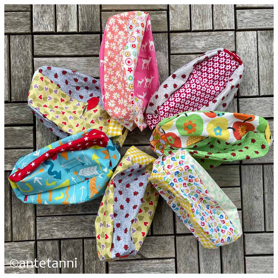 Dann dachte ich, es liegen ja noch jede Menge mehr Jerseyreste in der Schublade und mal schauen, ob sich die nicht auch wunderbar zu Mützen verarbeiten lassen. Stoffe zurecht gelegt, Schnittmuster rausgekramt… zack sind weitere 17 Mützen für das Spendenprojekt Bunte Stoffe gegen Grau entstanden.