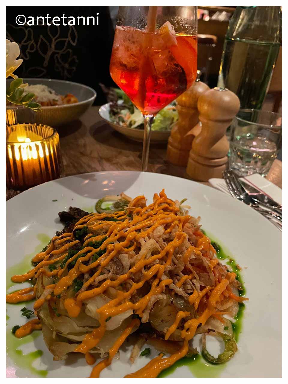 Kulinarisch habe ich im Restaurant Wessenberg einen sehr leckeren „Geschmorten Spitzkohl mit Röstzwiebeln, Paprikacoulis, hausgemachtem Kimchi und Schnittlauch“ und dazu einen „Pampelle Spritz“ (Pampelle, Prosecco, Soda) genossen.