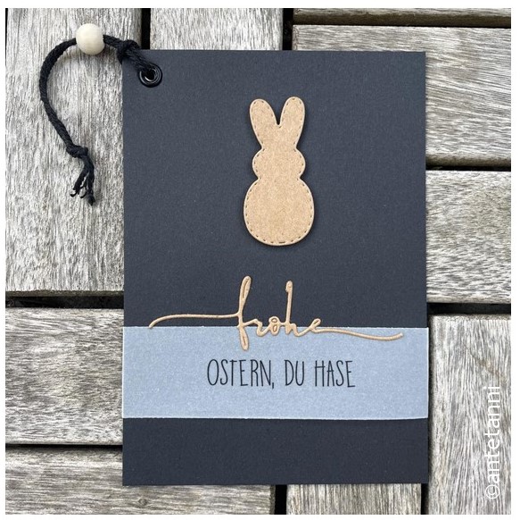 Auf eine Karte aus Kraftpapier im A6-Format habe ich einen ausgestanzten Osterhasen ebenfalls aus Kraftpapier (und mit einem Abstandspad dazwischen) geklebt. Die Ostergrüße sind ausgestanzt sowie auf Transparentpapier gedruckt, das ich als Banderole um die Karte herum gefaltet und hinten mit einem auf doppelseitigem Klebeband ausgestanzten Ei festgeklebt habe (leider habe ich die Rückseite vergessen zu fotografieren).