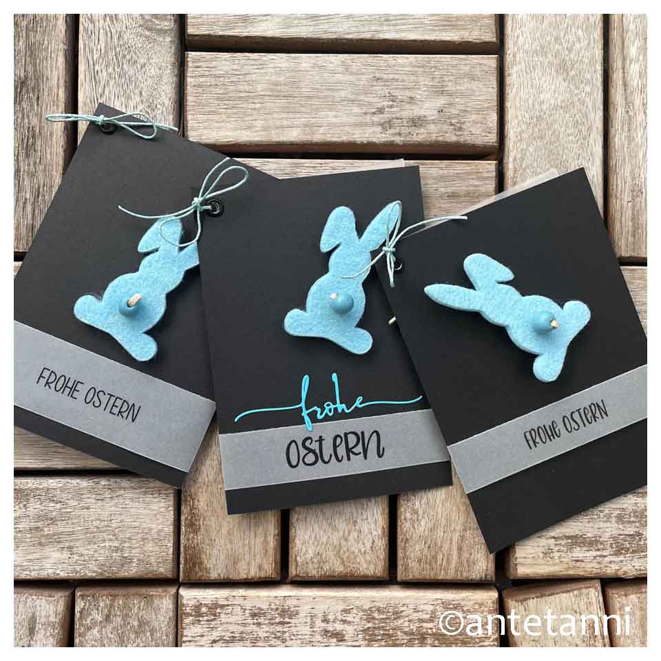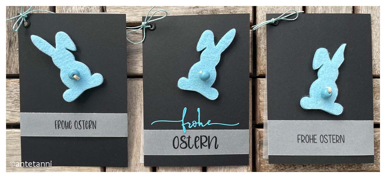 Als ich die Häschen sah, fielen mir die am Schreibtisch liegenden Wortstreifen ein und schon war die Idee für weitere Osterkarten geboren, die ich hoffentlich gerade noch rechtzeitig auf den Weg gebracht habe…